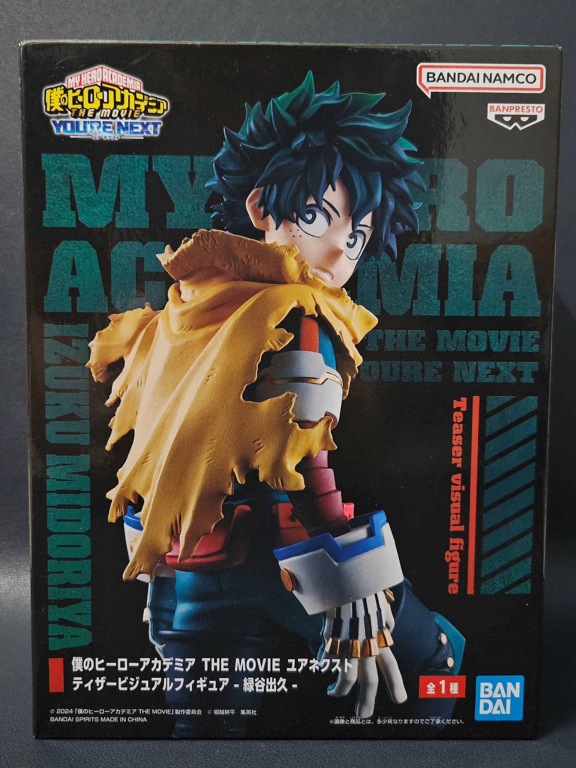 From the upcoming anime film My Hero Academia: You're Next, Banpresto presents the Izuku Midoriya Teaser Visual Figure. Standing approximately 8.3 inches tall, this meticulously crafted figure captures Midoriya in a dynamic pose, reflecting his determination and heroic spirit. The figure showcases intricate details of his hero costume as featured in the movie, making it a must-have collectible for fans of the series. This non-articulated figure is made of high-quality plastic and comes with a display base for stability.