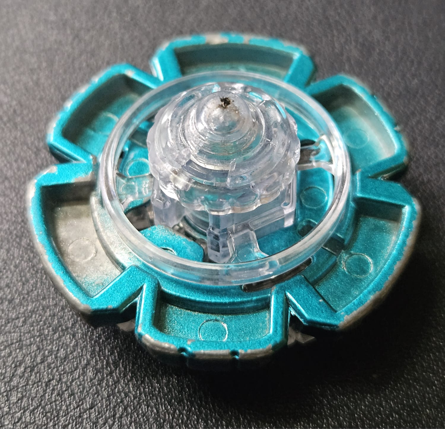 The Spin Track (145) is a standard mid-height track, offering balance between stability and attack reach. The Performance Tip (D – Defense) is a wide plastic tip that provides strong stamina and stability, making it harder for the Beyblade to be knocked off balance, though it reduces speed and aggression.
